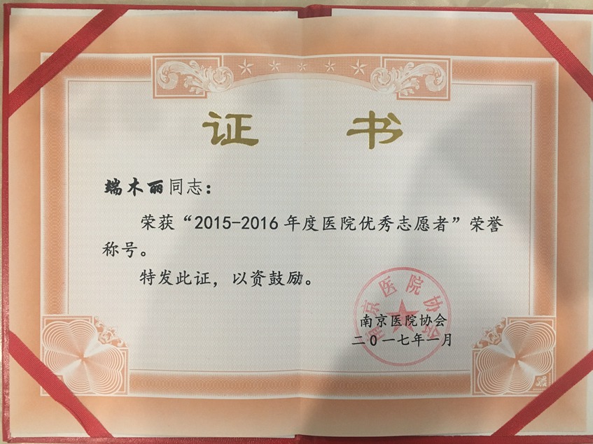 端木丽被南京新2网址 协会授予优秀志愿者称号